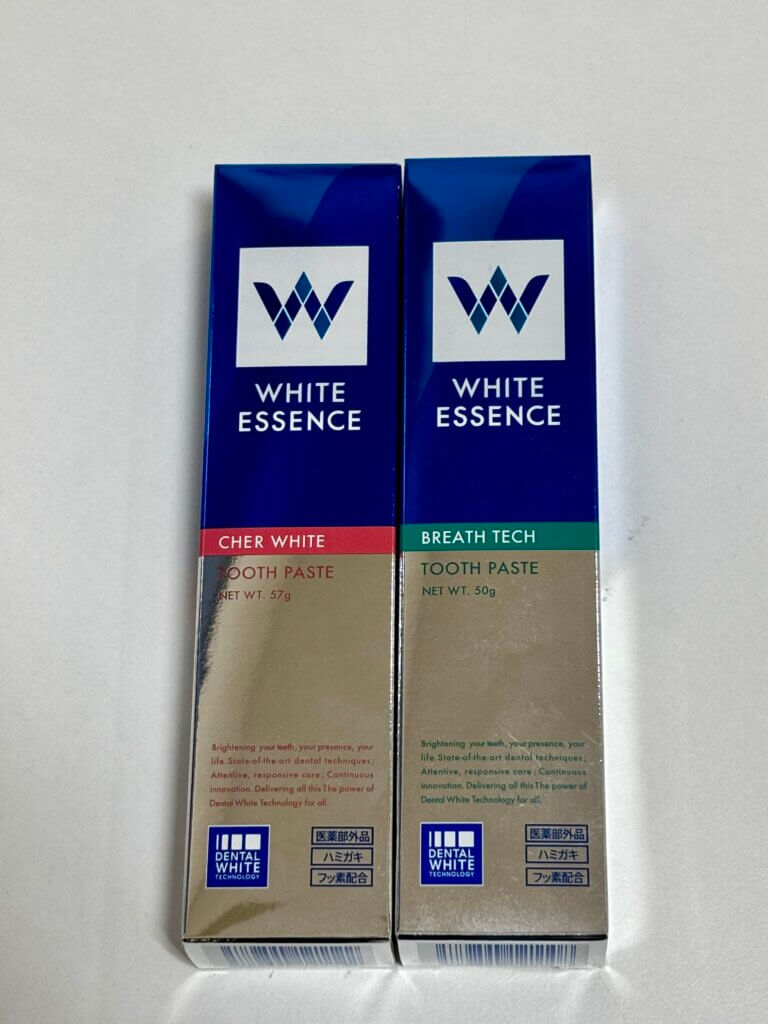 写真左側のピンク色のラインが入っているのがシェールホワイトです。コーヒーや茶渋などによる着色汚れに効果的なものとなっていてます。アプリコットの味がして美味しいですよ!