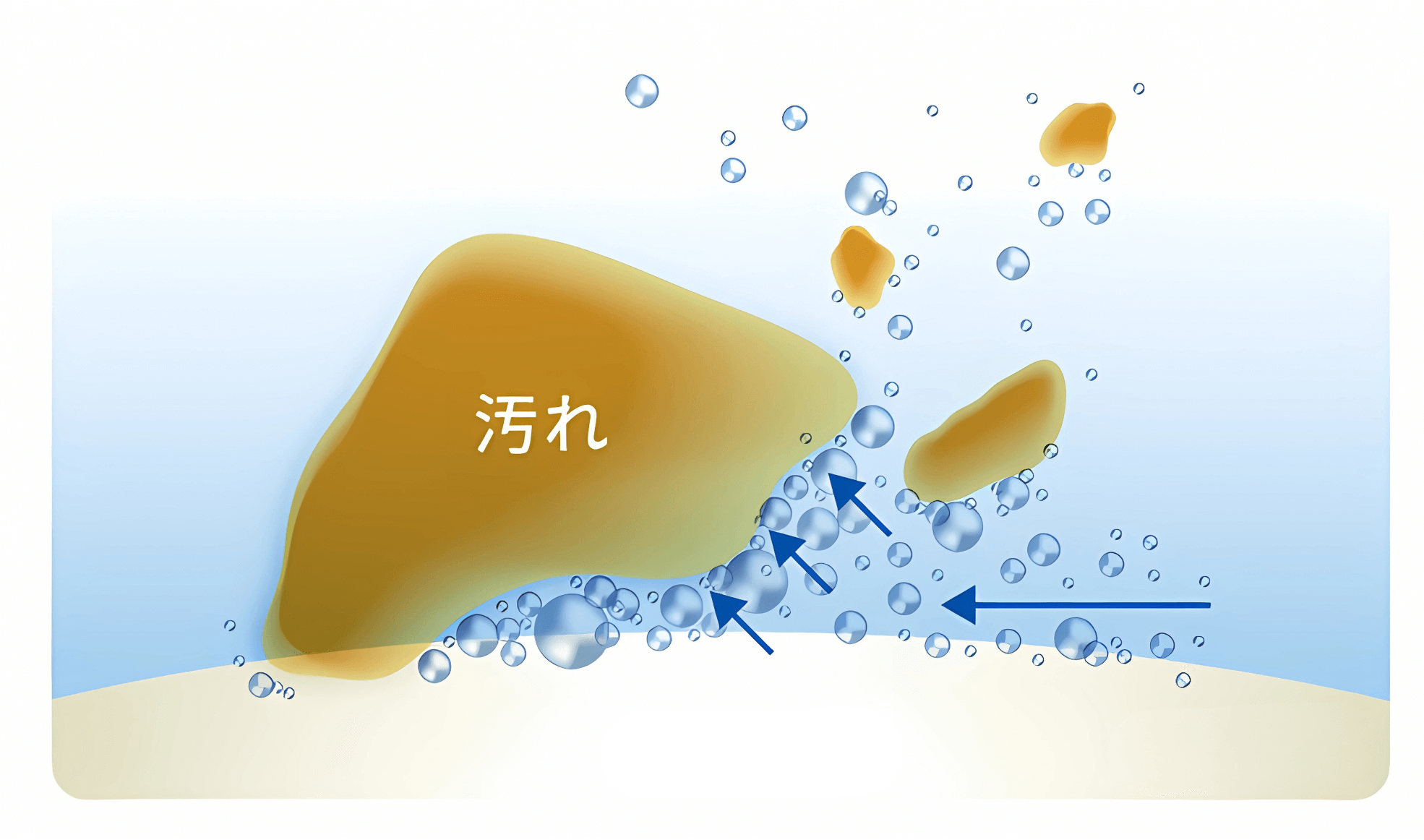 ウルトラファインバブルとは、目に見えないほど小さなナノサイズ=0.000001mmの泡のことです。汚れの隅々まで入り込んで洗浄効果を高め、汚れを吸着して剥離する効果があります。