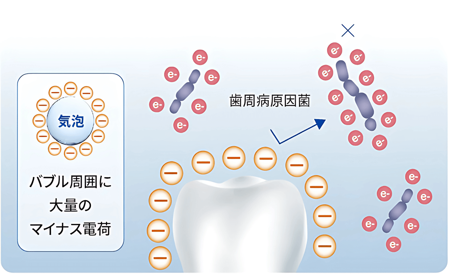 ウルトラファインバブルを生成する際、微細な気泡の周りには大量のマイナス電荷が帯びることになります。マイナス電荷が歯の表面に付着することによりプラークや細菌が持つマイナス電荷と反発し歯の表面をコーティングする機能が働きます。